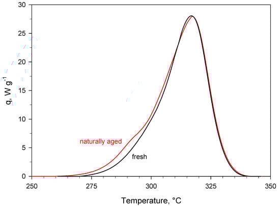 Specific (i.e., referring to the mass of sample) heat power curves (exothermal events) collected during dynamic DSC runs (heating rate of 20 °C min−1) carried out on fresh PA and naturally aged PA (i.e., PA stored for more than 10 years at ambient conditions in the Calorimetry Laboratory of CNR-STEMS).