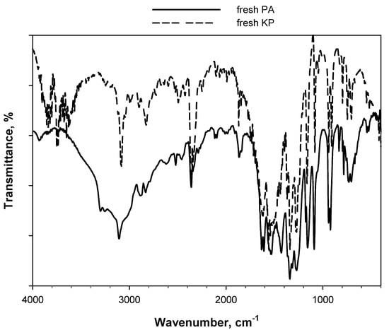 DRIFT spectra of fresh PA and fresh KP diluted in KBr (2 wt.% PA/KBr and 2 wt.% KP/KBr, respectively) recorded at 30 °C under an Ar flow.