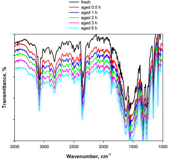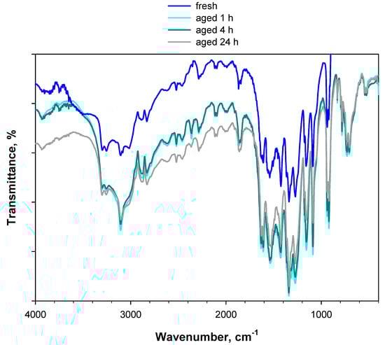 KBr exerts a promoting effect on the degradation of PA and, therefore, is an unsuitable diluting salt for investigating its accelerated ageing via in situ DRIFT experiments. In an attempt to identify an effective alternative solution, DRIFT experiments were repeated using ZnSe (instead of KBr) powder as the diluting salt. Recall that the window of the in situ DRIFT cell used in this work was made of ZnSe, which is much more water-tolerant and thermally resistant than KBr. The same concentration (2 wt.%) of (fresh) PA was diluted in ZnSe powder. As with KBr, the spectra of PA diluted in ZnSe were ratioed against pure ZnSe. Figure 9 shows the DRIFT spectra of 2 wt.% PA/ZnSe. The blue curve represents the fresh sample, whereas the other curves represent the sample artificially aged at 80 °C for up to 24 h under a 5 vol.% O2/Ar flow.