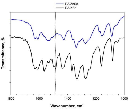 Even the spectrum of PA treated at 80 °C for 24 h under an oxidative atmosphere does not show significant differences compared to the spectrum of fresh PA, indicating the chemically inert behavior of ZnSe. This is clearer in Figure 10, which shows the spectra of 2 wt.% PA diluted in KBr or ZnSe after 24 h of treatment at 80 °C under a 5 vol.% O2/Ar flow. The band centered at 1485 cm−1 is present in the case of PA/KBr, but totally absent in the case of PA/ZnSe.