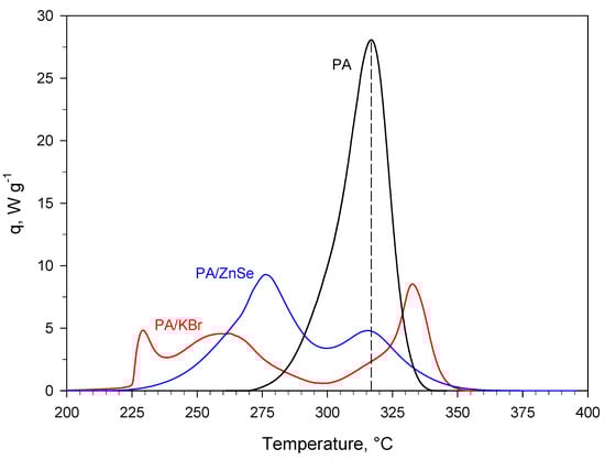Specific (i.e., referring to the mass of sample) heat power curves (exothermal events) collected during dynamic DSC runs (heating rate of 20 °C min−1) carried out on pure PA (i.e., PA without salt) and PA mixed with KBr (50 wt.% PA/KBr) or ZnSe (50 wt.% PA/ZnSe).