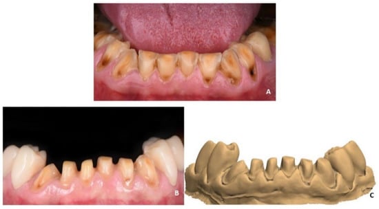 (A) initial situation with severe wear; (B) preparation of six frontal teeth with chamfer in the vestibular and proximal areas; (C) digital impression obtained with intraoral scanner (IOS).