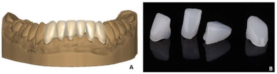(A) Six frontal restorations designed in DentalCAD software; (B) additively manufactured veneers with LCM technology directly after printing.