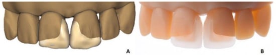 A typodont model of simulated diastema in the upper jaw was scanned with an IOS. Two restorations were designed in DentalCAD software with a minimal thickness of 0.1 mm (Figure 5A). The STL file of each restoration was sent to the CeraFab System S65 Medical 3D printer and printed with lithium disilicate in the generic color analog to the classical prep veneers as described previously. The supporting structures were placed on the proximal surfaces. The printing time depended on the height of the restoration and the chosen layer time—in this case, the total printing time was around 5 h. After cleaning, debinding, and sintering, the supports were removed manually, as described above. The restorations were tried in the model (Figure 5B).