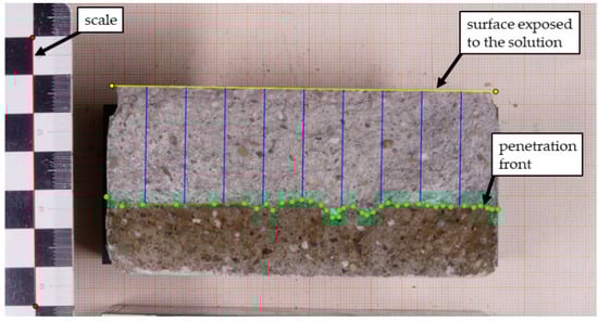Usually, the thickness measurements are performed with a Vernier caliper. In our study, we determine the penetration depths by taking a digital photo perpendicular to the fracture surface. Processing the digital image with a software tool (RCM-App) allows magnification and subsequent contrast improvement, if necessary, to support a clear distinction between the section of the specimen containing chloride ions and the unaffected part. For the conversion between distances in the image and actual distances, we include a scale in each photo placed within the plane of the fracture surface (see Figure 1).
