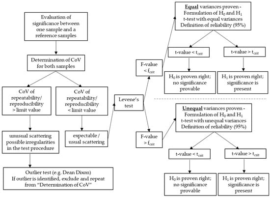 Considering the presented aspects regarding the CoV and the two-sample t-test, it becomes obvious that a multistage criterion where the tests are set in line is necessary to correctly evaluate significance or scatter. The proposed approach is visualised in Figure 2. Comparable approaches are suggested in the field of non-destructive in situ strength assessment of concrete for the identification of test regions for the evaluation of non-destructive testing presented in [].