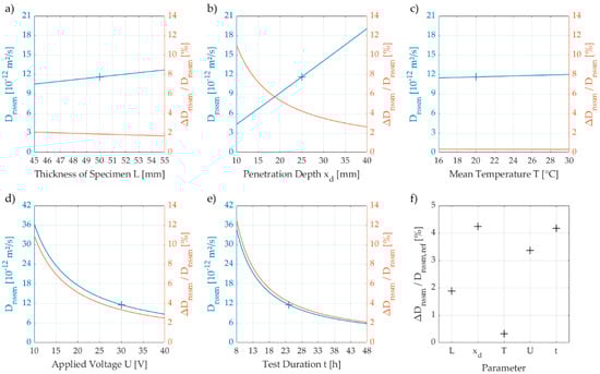 To reduce scatter and avoid high CoV, the tester needs to be sensitised to the working steps where unintentional errors have the greatest impact on the test result. Therefore, we performed a simplified sensitivity analysis and quantified the effects of each parameter of equation (2) on the Dnssm-value, see Figure 3. As reference, which is indicated with crosses in Figure 3a)–e), we chose a specimen with a thickness of 50 mm (L) and a penetration depth of 25 mm (xd). The boundary conditions for the reference were set to 30 V (U), 24 h (t) and 20 °C (T).
