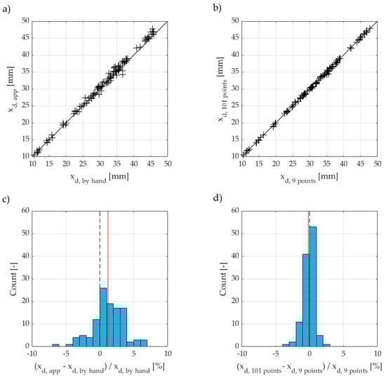 Surprisingly, the results from the analysis of 101 points do not differ significantly from the analysis of 9 points. Although there are single results with deviations up to −3.1% and +2.6%, respectively, the mean of the distribution shows a negligible deviation of −0.2% (see Figure 4d, vertical red line).
