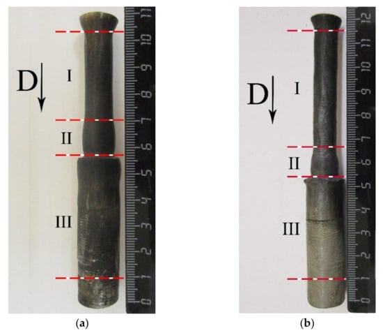 Figure 4 shows ampoules No. 1 and No. 2 after the SWE experiments. The ampoules were studied in the following order: segment I, segment II, and segment III (see Figure 4). Arrow D shows the detonation direction from the detonator to the end of segment II.