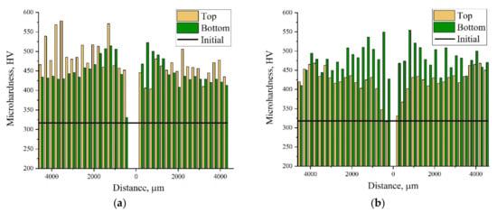 Figure 6 shows the bar charts of microhardness distribution in the transverse cross-sections. The microhardness measurement started at point 0 from the inner wall of the tube (point 0). The measurement results show that the average microhardness in both ampoules was the same, and it increased by 60–65% after SWE (Figure 6). The minimum microhardness in both ampoules was 325 HV, and the maximum was 550 HV.