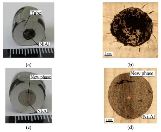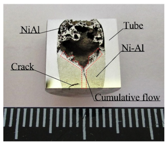The results of the metallographic analysis indicate that the process of high-velocity collapse of the tube in ampoule No. 1 created conditions for the formation of cumulative flow, which directly affected the phase formation in NiAl (Figure 7c, Figure 8c and Figure 11a,b). Presumably, this cumulative flow formed during the tube collapse when the deformation of the inner wall and its surface activation occurred, contributing to the capture and removal of metal particles from the surfaces by the cumulative flow.