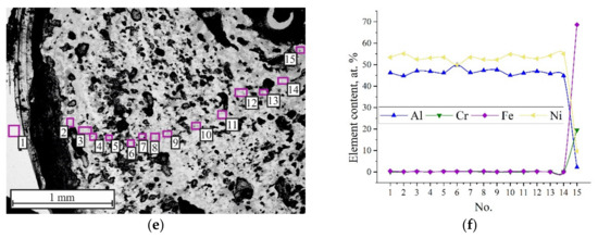 Figure 8e,f show the SEM image of the lower part of ampoule No. 2 and the results of EDS analysis. It was found that the entire powder sample in segment II consisted of NiAl.