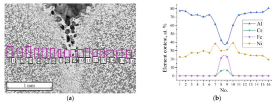 The EDS analysis of the phase composition of the transition region between the synthesized and compacted part in the sample of ampoule No. 1 showed that the transition region is divided into two parts (Figure 11a). The central part consists of NiAl with Fe content up to 20 at.% and Cr up to 7 at.% (Figure 11a,b, points 8 and 9) with width ranging from 0.2 to 6 mm. The other part of the powder sample consists of NiAl3 with a maximum width of 100 µm (Figure 11a,b, points 7, 10).