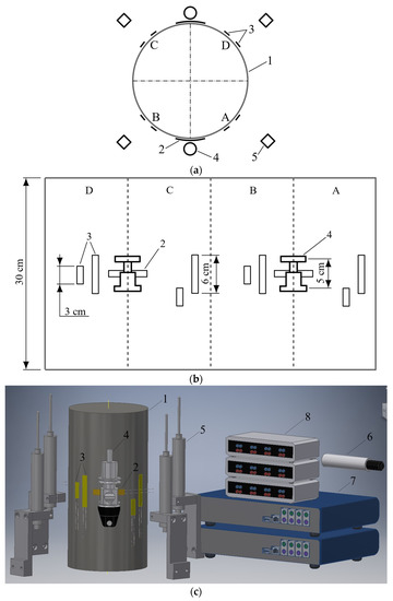 Testing setup: (a) Measurement device location scheme; (b) Specimen surface development; (c) General view; (d) Specimen before loading. 1. Cylindrical concrete specimen; 2. Transverse SG sensors; 3. Longitudinal SG sensors; 4. HAT devices; 5. LDT devices; 6. Load sensor; 7. Data logger; 8. Wheatstone bridge; A, B, C, and D sectors (according to Figure 2a).