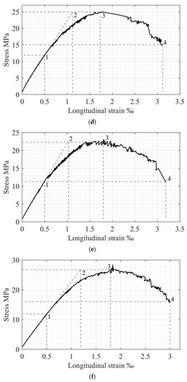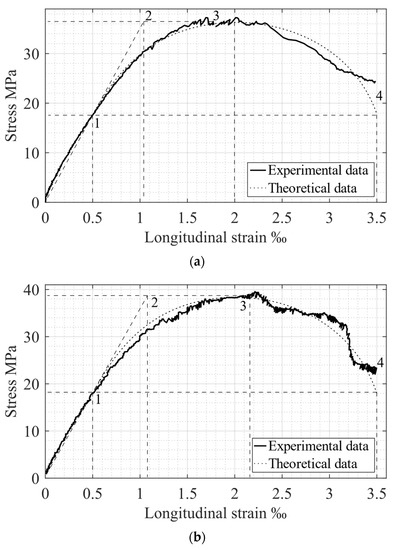 One of the first attempts to investigate the compressed concrete stress-strain () relationship was conducted at the beginning of the previous century [3]. Later, Hognestad investigated 190.5 cm-long compressed concrete column specimens with square sections of 25.4 × 25.4 cm and 223.5 cm long ones with circular sections 30.5 cm in diameter [4]. An analytical parabolic model was proposed to describe the ascending branch of the diagram, and the descending branch was represented by a linear dependence. This model was later modified by using new experimental data obtained for concrete specimens with a height-to-diameter ratio of 2 subjected to compressive loading controlled by a constant deformation rate [5,6]. However, the modified model is described by a more complicated mathematical expression. In the authors’ opinion, it is a general problem of empirical relationships that leads to the questionable accuracy of models and does not have theoretical confirmation.