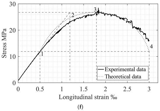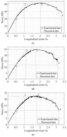 As mentioned above, the main parameters for concrete behavior under compressive load are stresses and strains, determined by points 1–4 in Figure 1 and Figure 3. A comparison of the corresponding experimental and theoretical data is presented in Table 5. Consequently, a graphical representation of theoretical and experimental diagrams is shown in Figure 5. The results of comparing the theoretical and experimental potentials values of the stress-strain diagrams [13] are presented in Table 6.