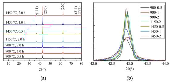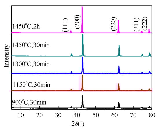 Figure 3 and Table 3 show XRD data and calculated grain sizes of MgO samples calcined at 900 °C, 1150 °C, and 1450 °C for 30 min, 1 h, and 2 h, and cooled in the oven.