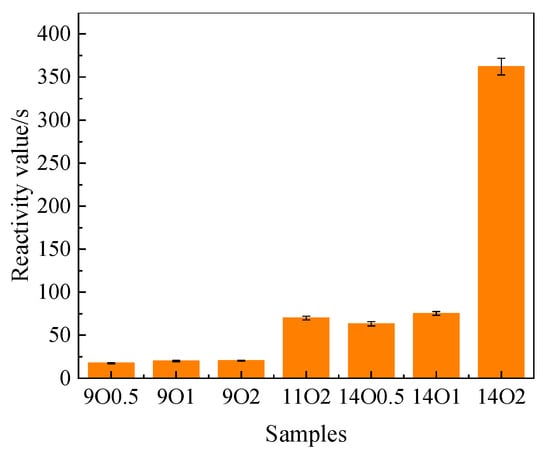 The reactivity of MgO hydration is defined as the neutralization time required when using a weak acid solution. Figure 4 shows the neutralization times of samples cooled in the oven. The reactivity of MgO calcined at 900 °C was approximately 20–30 s. As there was no significant difference in grain size between samples 11O2, 14O0.5, and 14O1, the reactivities of these samples were similar.