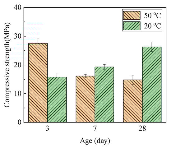 Figure 5 shows the compressive strength of M-S-H prepared using SF and MgO calcined at 1450 °C for 2 h. The paste’s compressive strength after curing in water at 20 °C increased as it aged, and reached 25 MPa after 28 d. For samples cured at 50 °C, the paste’s compressive strength decreased over time. The solid volume increased approximately 118% [27] or 120 % [15] after MgO hydration. Cement mortars will crack or collapse when the stress of their expansion exceeds the mortars’ tensile strength. In this study, MgO expansion resulted in decreased strength. The surface of the sample cured in water at 80 °C significantly cracked; as a result, no valid compressive data were measured.