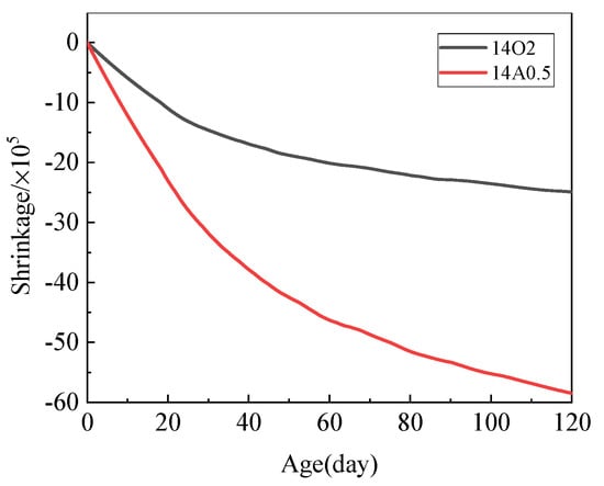 The shrinkage of mortars prepared using MgO calcined at 1450 °C for 0.5 h and 2 h, cooled in air and the oven, respectively, is depicted in Figure 6. The shrinkage curves can be divided into two stages. An approximate linear growth period was observed before 20 d, and the second stage was a deceleration period. Shrinkage in the linear growth period accounted for 40% of shrinkage in the first 120 d. That the mortar prepared using 14A0.5 had more shrinkage is consistent with the experimental results of Ma [28] This indicates that the formation of MH in M-S-H systems did not cause expansion in the system [29,30]; this differs from the expansion caused by periclase in traditional silicate cement.