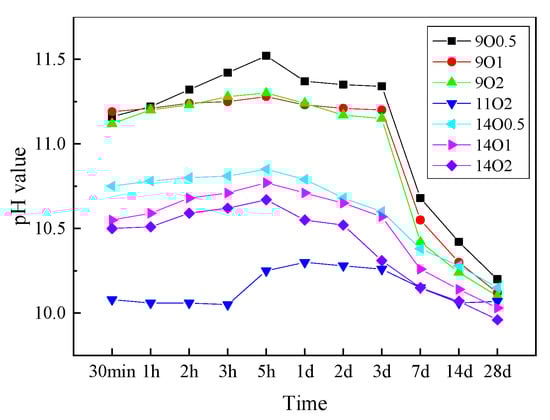 Figure 7 shows the pH values of SF and MgO mixtures that were calcined at different temperatures and cooled in the oven. The pH values of all samples exceeded 10.0, and the pH values of samples with MgO calcined at 900 °C exceeded 11.0. The pH values of all samples gradually increased over time, reached a maximum value when water was added at 5 h, and then gradually decreased. At 28 d, the pH values of all samples had decreased to 10.0–10.2. As the calcining temperatures and times of MgO decreased, the pH values of mixtures decreased. With the similar grain size of 11O2, 14O0.5 and 14O1, the pH value at different time is close to each other. The pH value of 14O2 sample is the lowest in different age. The pH value of MgO/SF paste mixed with dead-burned MgO increased in the first 12 h, and then decreased. Pastes’ pH values did not exceed the pH value of the saturated Mg(OH)2 solution (10.52) at different curing times. These results indicate that no Mg(OH)2 crystals will be produced in pastes prepared using MgO calcined at 1450 °C for 2 h. After 1 d, the consummation rate of Mg2+ for M-S-H formation was higher than MgO’s dissolution rate.
