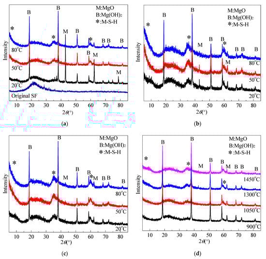 Figure 8 shows XRD patterns of silica fume and pastes of silica fume and MgO calcined at different temperatures for 30 min and cooled in air. XRD patterns show that SF is an amorphous (non-crystalline) material with broad diffuse peaks in the 15°~30° range. The peak maximum intensity was present at approximately 21.5° 2θ. When water was added to the mixtures for 3 d, a significant amount of unreacted MgO was observed in the paste prepared using silica fume and MgO calcined at 1450 °C. The periclase diffraction peaks decreased with the curing temperature and time, and almost disappeared at 28 d. Early in the curing process (3 d), brucite peaks increased with increased curing temperature. Increasing the curing temperature accelerated the hydration of MgO. After 14 d, due to the low MgO content and acceleration conversion from Mg(OH)2 to M-S-H by high curing temperature, Mg(OH)2 diffraction peak intensity decreased with temperature. In contrast with paste curve cured in 50 °C water, the Mg(OH)2 diffraction peak were weaker than for the sample cured in 20 °C and 80 °C water. This indicates that the optimal curing temperature for the formation of M-S-H prepared using dead-burned MgO is approximately 50 °C. In Figure 8d, it can be observed that a small amount of MgO remained in pastes containing MgO calcined at 1300 °C and 1450 °C.
