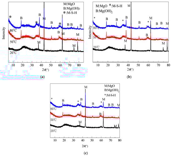XRD measurements confirmed the presence of M-S-H (reflections at 5.0, 10.0, 19.7, 26.7, 35.0, and 59.9° 2θ [21,23,31] ) in samples cured in 20 °C, 50 °C, and 80 °C water for 3 d. Comparing XRD patterns of samples cured at 50 °C and at 80 °C indicated a slight difference. At 14 d and 28 d, the M-S-H peak intensity of the sample cured at 80 °C was weaker than that of the sample cured at 50 °C, especially on the low-angle side. Asymmetric peaks were considered to be typical lamellar and turbostratic structures [20]. Promoting curing temperature enhanced the hydrolyzation of Mg(OH)2 and increased the pH, which contributed to the dissolution of amorphous SiO2 [19]. However, the excessive pH value reversely restrained the dissolution of amorphous SiO2 and the formation of M-S-H [32].