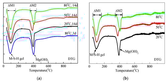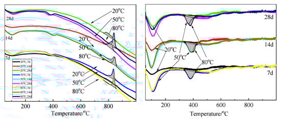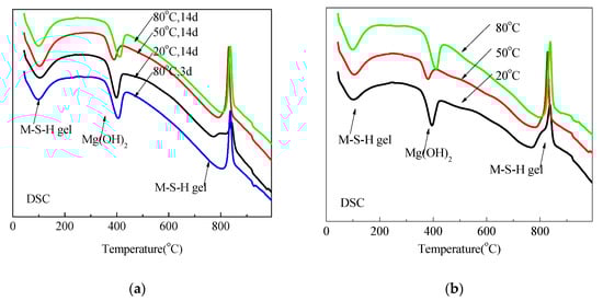 The valley at approximately 100 °C and the peak at approximately 850 °C were assigned to the formation of M-S-H. Corresponding to much lower Mg(OH)2 contents for samples cured in 50 °C than for samples cured in 80 °C after 14 d and 28 d, the peak and valley indicated that the formation of M-S-H for the former was much higher than for the latter. Moreover, at approximately 850 °C the endothermic peaks of samples cured at 80 °C for 3 d were higher than those of samples cured at 20 °C for 28 d.