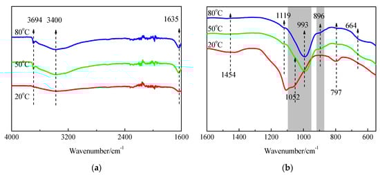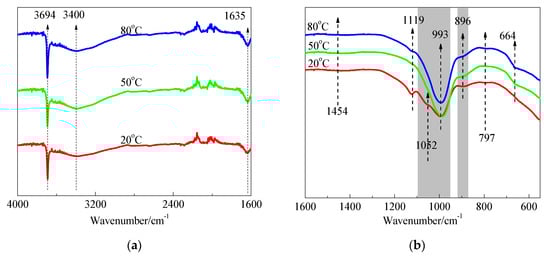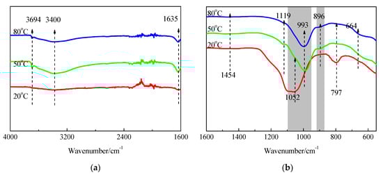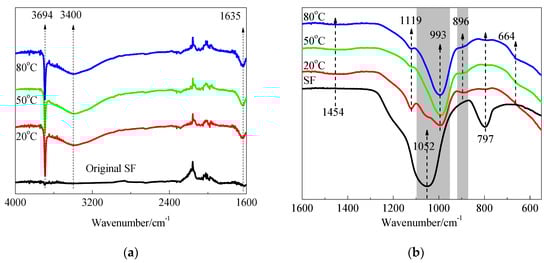 The FTIR spectra of SF and hydration products of MgO-SF blends after 14 d and 28 d of curing in 20 °C, 50 °C, and 80 °C water are presented in Figure 13 and Figure 14. A sharp absorption near 3694 cm−1 was associated with the Mg–OH stretch vibrations of M-S-H and brucite [21,23]. The characteristic stretching vibrations of the O–H group in H2O or hydroxyl were observed near 3400 cm−1; the band at 1635 cm−1 was due to molecular H2O’s hydroxyl bending vibration [38].