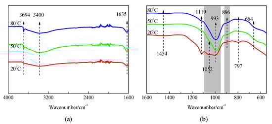 As already detailed by Nied [21] and Bernard [19], absorption bands at 870–920 cm−1 and 950–1100 cm−1, as depicted in Figure 13 and Figure 14 by the grey shaded regions, indicate the presence of Q3 and Q2 silica species [19]. In this study, the intensity of the 896 and 993 cm−1 bands increased as curing temperature increased, which indicated a higher curing condition contributing to the polymerisation degree (PD) of the silicate network. A newly formed weak band at 1119 cm−1 was also attributed to Q2 Si–O stretching vibrations. This band transformed to a shoulder after curing in water at 50 °C for 14 d, and disappeared by day 28; however, it still existed on day 28 for the 80 °C curing condition. This indicated that the optimum curing temperature for dead-MgO and silica pastes was approximately 50 °C, which is in agreement with XRD, DTG, and DTA results.