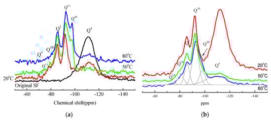 In contrast to the curve of the sample cured at 20 °C, the signal at −97.6 ppm in the curve of the sample cured at 50 °C noticeably increased, and resonances at −111 ppm originating from the Q4 site almost disappeared. Although the majority of silica was consumed, a small amount of SF remained in the sample cured in 80 °C water for 28 d. Similar to chemical shifts reported in [25], in this study chemical shifts at −92.7 ppm and −97.7 ppm assigned to Q3 sites indicated the presence of the silicate sheet structure. Data showed that in comparison to samples prepared using MgO calcined for only 30 min, samples prepared using MgO calcined for 2 h had a lower degree of polymerisation.