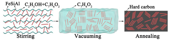 Commercially available micron-sized FeSiAl flakes (Si 9.8 wt%, Al 5.6 wt%, and Fe 84.6 wt%, Jiangsu Baona Electromagnetic New Material Co., Ltd., Zhenjiang, China) with a purity of 99% were used in this study. The other materials included phenolic resin (Shanghai Macklin Biochemical Co., Ltd., Shanghai, China, 99.8%) and ethanol (Shanghai Titan Chemical Co., Shanghai, China, 99.7%). FeSiAl powders and phenolic resin (mass ratio of 1:1, labeled as S1) were stirred with a magnetic stirrer for 0.5 h with 8 mL of ethanol. The mixture in the quartz boat was placed in vacuum for 0.5 h, then annealed at 800 °C for 3 h in a flowing hydrogen atmosphere, and finally cooled down to room temperature. The synthesized hard carbon embedded with FeSiAl composites (FeSiAl@HC) displayed dark products with a glossy surface. For comparison, FeSiAl flakes to phenolic resin mass ratios of 1:2, 1:3, and 1;4, labeled as S2, S3, and S4, respectively, were prepared following the same procedure. The raw FeSiAl flakes were named as S0. The synthesis of FeSiAl@HC composites is outlined in Figure 1.