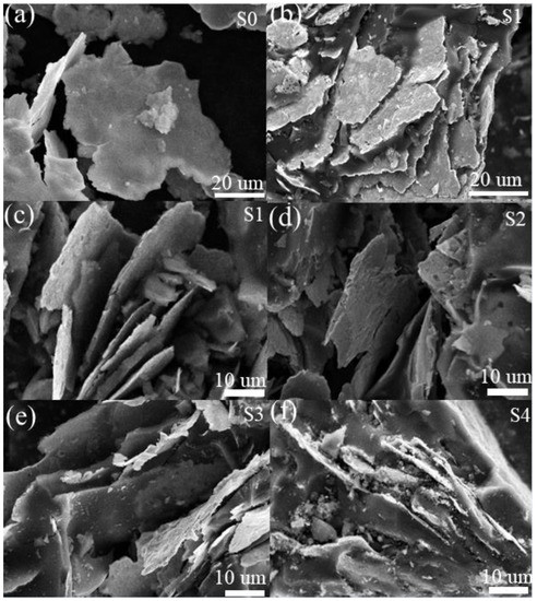 The structure and morphology of the samples were examined by SEM. As shown in Figure 2a, FeSiAl flakes could be observed with a thickness of 1 μm and diameters of 20–90 μm. After being embedded into HC, these flakes exhibited a layered structure (Figure 2b). The high-resolution image of S1 (Figure 2b) indicates that the orientation of FeSiAl flakes was largely irregular. We also found a space between the FeSiAl flakes. This is possibly because a higher content of FeSiAl flakes facilitates dividing the HC into species. As the content of HC increased, the space enlarged, as shown in Figure 2d. This is because HC easily forms a solid entirety, leading to the further separation of the FeSiAl flakes. As the content of HC increased, FeSiAl flakes were completely embedded into large solid HC. Single FeSiAl flakes were difficult to observe. As shown in Figure 2e,f, the surfaces of S3 and S4 were almost HC, with several pieces of FeSiAl flakes. These results suggested the formation of FeSiAl@HC composites, which was also confirmed by the analyses of TEM images (Figure S2).