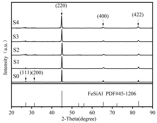 Figure 3 depicts the XRD patterns of the FeSiAl and FeSiAl@HC samples. For S0 to S4 in Figure 3, the diffraction peaks located at 27.1°, 31.4°, 45.0°, 65.5°, and 83.0° can be categorized as the (111), (200), (220), (400), and (422) planes of FeSiAl (PDF# 45-1206), respectively. Neither the two diffraction peaks located at approximately 23.7° and 43.6° of hard carbon [15], nor the peak at approximately 26° for graphitized [18] or amorphous [25] can be found in Figure 3. The reason may come from two aspects: first, hard carbon belongs to non-graphitizable carbon with a very low degree of crystallinity; second, the micron-sized flaked-FeSiAl devastates the crystallization process of hard carbon (as shown in Figure 2).