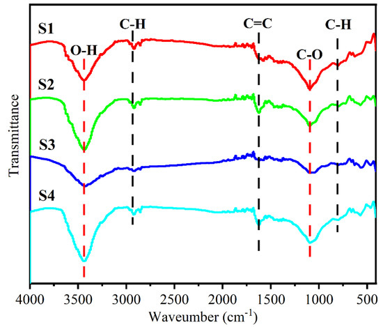 Figure 4 displays the FTIR spectra of the FeSiAl@HC samples. The FTIR analyses showed that four samples (S1–S4) had similar spectra. The strongest absorption peaks at around 3441 cm−1 for all five samples corresponded to the hydroxyl stretching band of the O-H [15,26]. The second strongest absorption peaks at approximately 1096 cm−1 for S1 to S4 samples were assigned to the stretching band of C-O. The other bands were associated with C-H, C=C, and C-H vibrations [15,26]. The functional groups in FeSiAl@HC can act as the polarization centers, resulting in the enhancement in the dielectric loss [15].