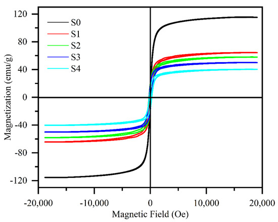 Figure 5 presents the magnetic hysteresis loops of the FeSiAl and FeSiAl@HC samples at room temperature. The five samples exhibited the typical S-shape characteristic of soft magnetic alloys. The values of saturation magnetization (Mr) of the five samples were 116.0, 64.4, 58.1, 50.2, and 40.3 emu/g for S0–S4, respecitvely. They correspond well to the contents of the flake-shaped FeSiAl alloy powders (Table 1). A similar phenomenon was found for other FeSiAl composites [24].