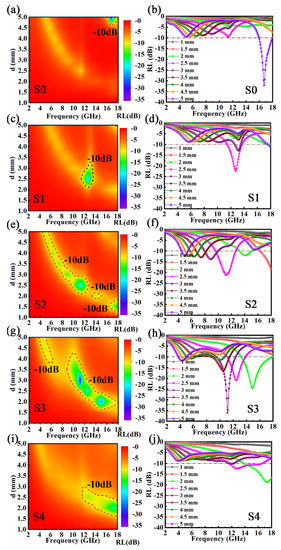 RL contours and RL−2D curves of the FeSiAl and FeSiAl@HC samples: (a,b) S0, (c,d) S1, (e,f) S2, (g,h) S3, and (i,j) S4.