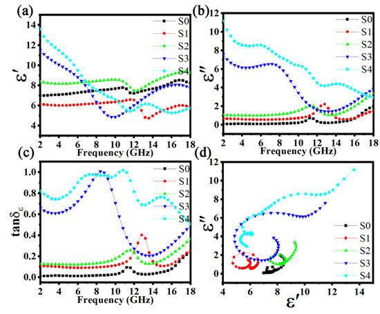 Figure 8 displays the real permittivity (ε′), imaginary permittivity (ε″), dielectric loss tangents (tanδε) from 2.0 to 18.0 GHz, and Cole–Cole semicircles (ε″/ε′) for FeSiAl and FeSiAl@HC composites. As shown in Figure 8a, the values of ε′ of S0, S1, and S2 fluctuated by approximately 7, 6, and 8 from 2 to 18 GHz, except having a small trough at approximately 11.5, 12, and 13.5 GHz, respectively. However, S3 and S4 showed large decreases from 11.5 at 2 GHz to 5 at 9.5 GHz, and from 14 at 2 GHz to 5.5 at 11.5 GHz, and then fluctuated in the range of 5–8 to 18 GHz, respectively. As shown in Figure 8b, the ε″ values of S0, S1, and S2 were almost constant until approximately 10 GHz, and then a small peak appeared, and finally gradually increased to 18 GHz. However, just like the trend in ε′, the ε″ values of S3 and S4 were large and showed large changes. The ε″ of S3 slightly decreased from 8 to 6 until 8 GHz, then sharply decreased to 1 at about 13 GHz, and then slowly increased to 3.5 until 18 GHz, while the ε″ of S4 slowly dropped from 11.5 to 3.5 throughout the testing period. The tanδε of the five samples followed a similar change trend to ε″, except that there was a large peak from the S3 sample and two large peaks from the S4 sample, as shown in Figure 8c.
