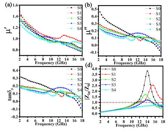 Figure 9 depicts the real permeability (μ′), imaginary permeability (μ″), magnetic loss tangent (tanδμ), and the impedance matching parameter (Zin/Z0) for the FeSiAl and FeSiAl@HC composites. As shown in Figure 9a, the values of μ′ for five samples were very close and rapidly decreased from approximately 1.4 to about 0.85 as the frequency increased during the testing period, but a peak occurred at approximately 14 GHz for S1. The changing trends in the values of μ″ and tanδμ for the five samples were similar to those of μ′, except for a broad peak from the S3 sample, as shown in in Figure 9b, c. The real permeability (μ′), imaginary permeability (μ″), and magnetic loss tangent (tanδμ) of FeSiAl are affected by the carbon matrix, similar to FeSiAl/graphite [16,18] and carbon-encapsulated FeSiAl hybrid fakes [11]. Figure 9d displays the dependences of the normalized input impedance Zin/Z0 in the five samples. The value of Zin/Z0 from the S3 sample approached one across a wider frequency range than that of the other four samples. A value of Zin/Z0 close to one indicates the best impedance matching and thus excellent microwave absorption properties. Therefore, the excessively complex permittivity of the S4 sample is generally undesirable.