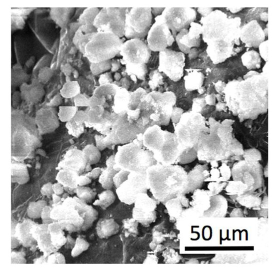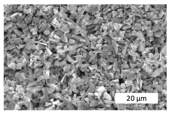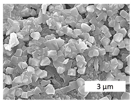 In the experiments, nanopowders ZrO2 partially stabilized by 5 wt.% Y2O3 were used. An SEM image of this powder is presented in Figure 2, while in Figure 3, there is an SEM image of α–Al2O3 nanopowder. Both materials were delivered by NANOE (Ballainvilliers, France). The homogenous mixture of these powders was prepared using a planetary mill Pulverisette-6 (Fritsch GmbH, Idar-Oberstein, Germany) with a dry method. Then, an isopropyl alcohol was added, and the powders were mixed during 2 h. Rotational speed of the planetary disc was 160 rpm. Afterwards, the powders were dried up. Large agglomerates, seen in Figure 2, were destroyed and not found in the final mixture of powders.