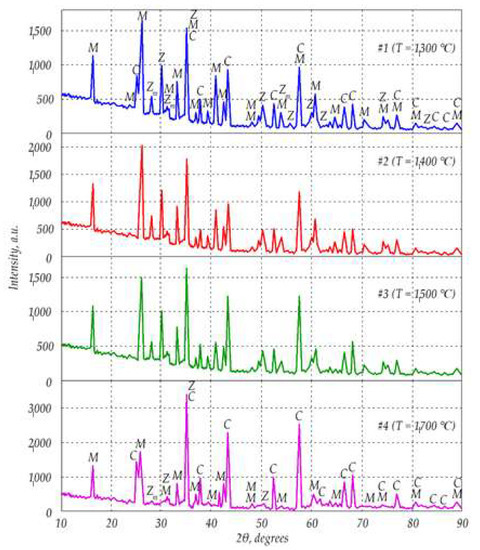 Results of XRD analysis of the samples sintered at different temperatures are shown in Figure 6. The sample #1 was fabricated at 1300 °C, #2 at 1400 °C, #3 at 1500 °C, and #4 at 1700 °C. Peaks correspond with mullite (M), corundum (C), and zirconia (Z), respectively. Additionally, Zm stands for monoclinic phase of ZrO2.
