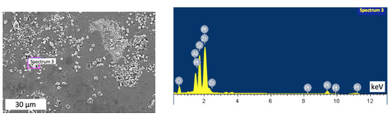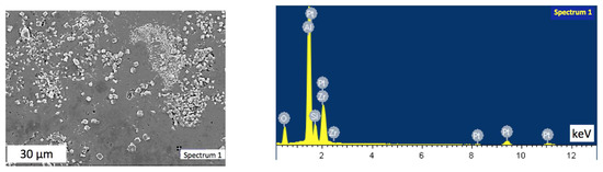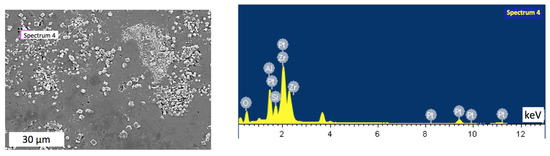 Notably, the sintered samples exhibited some inhomogeneity, with clear agglomerations. Thus, an area with visible uneven distribution of inclusions was chosen for the analysis. Figure 7, Figure 8, Figure 9 and Figure 10 indicate points on sample #4, where the elemental analysis was performed, together with corresponding spectra. Respective percentage of the elements in each point are presented in Table 1, Table 2, Table 3 and Table 4. Elemental analysis of other samples sintered at lower temperatures did not show any significant differences.