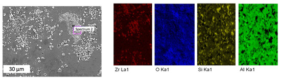 According to the available published data [30], reaction expressed by Equation (5) occurs at the temperatures above 1342 °C and is accompanied by the increase in volume of almost 12%. Thus, the proportion of components by weight percentage of 70% of Al2O3, 20% of SiO2, and 10% of ZrO2, allowed for obtaining calculated composition at 1342 °C in following proportions: Al2O3—20.68 wt.%, ZrO2∙SiO2—24.80 wt.%, and 3Al2O3∙2SiO2—54.52 wt.%.