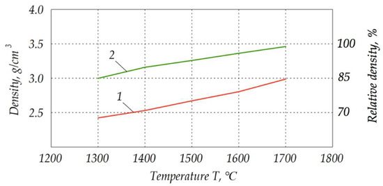 It would be expected that densification is more effective at higher temperatures. The experiments confirmed an almost proportional increase in density with increasing sintering temperatures, which is seen in the graph in Figure 12. Comparison of the traditional sintering method (line 1) with the novel electroconsolidation (line 2) proves undoubted advantage of the latter method.