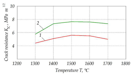 Fracture toughness of the composite Al2O3—20 wt.% SiO2—10 wt.% ZrO2 sintered at different temperatures: 1—traditional sintering, 2—electroconsolidation.
