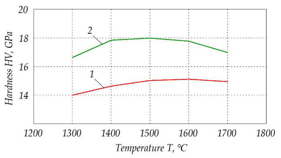 As a result, fracture toughness of the ceramics after electroconsolidation was higher than that after traditional sintering. Respective curves are shown in Figure 13. Noteworthy, fracture toughness KIC of ca. 5.9 MPa∙m½ was obtained by electroconsolidation at 1300 °C, while for the traditional sintering it was a maximal possible value obtainable at 1500 °C. In both cases, however, maximal fracture toughness was reached at 1500 °C, and its value decreased at higher sintering temperatures, but KIC of the samples obtained by electroconsolidation was always by 20–30% higher. Similar trends are clearly seen in the graphs of hardness shown in Figure 14, with a shift of maximal value to the temperature of 1600 °C in the case of traditional sintering method.