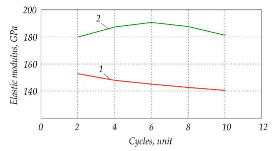Elastic modulus E after heating cycles for Al2O3—20 wt.% SiO2—10 wt.% ZrO2 composite samples fabricated at 1400 °C by: 1—traditional sintering, 2—electroconsolidation.