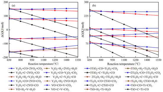 Gibbs free energy of standard reaction for reduction of vanadium oxide and titanium oxide: (a) vanadium oxide; (b) titanium oxide.