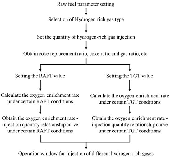 When hydrogen–rich gas is injected, the amount of hearth gas increases, the RAFT decreases, and the TGT increases. The ranges of RAFT and TGT can be adjusted by increasing the blast oxygen enrichment rate. RAFT is an important parameter for the blast furnace operator to judge the thermal state of the hearth. It determines the initial gas temperature of the hearth, thus affecting the heat transfer, reduction, slagging, desulfurization, hot metal temperature, composition, etc. When hydrogen–rich fuel is injected, the RAFT becomes low, which reduces the replacement ratio, and with the increase in hydrogen–rich fuel consumption, the furnace condition may even deteriorate. Too high RAFT will also cause the initial gas volume expansion in the hearth, and a large amount of SiO volatilizes, which increases the resistance to the charge column, affects the decline of the charge, and even makes the blast furnace difficult to run and suspend. Too–high or too–low TGT is also unfavorable to the production of blast furnace. Too–high TGT will increase the heat loss in the furnace, increase the coke ratio, and shorten the service life of furnace top charging equipment and bag filter. Too–low TGT will cause the gas temperature to be lower than the dew point, further causing dust to block the filter cloth, making it lose its filtering function and greatly reducing the dust removal efficiency. Therefore, in order to discuss the operation constraints of injecting hydrogen–rich gas, the allowable injection amount of hydrogen–rich gas (Abscissa) and blast oxygen enrichment rate (Ordinate) are often used to describe the feasible operation window on the premise of maintaining the thermal state of blast furnace (reasonable RAFT and TGT) [15,21,22]. The calculation process of the operation window is shown in the Figure 2.
