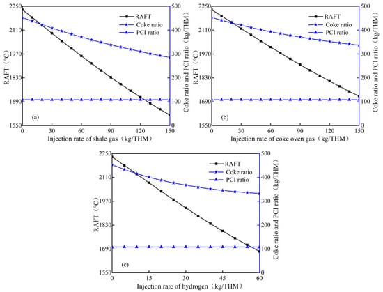 Figure 3 shows the variations of raceway adiabatic flame temperature and coke ratio after injecting hydrogen–rich gas with fixed PCI (108 kg/THM). When only pulverized coal is injected, the RAFT is 2230.3 °C. As each of the three hydrogen–rich gases replaces part of the coke and starts injection, the RAFT decreases at a slower rate with the increase in the injection quantity. However, the effect of different hydrogen–rich gases’ injection on the RAFT is obviously different. When the shale gas is injected (Figure 3a), the RAFT decreases at a rate of 4.7~3.4 °C/kg with the increase in injection quantity; the RAFT also drops to 2000 °C with the injection quantity of shale gas reaching 50.4 kg/THM. Figure 3b shows that injecting coke oven gas will decrease the RAFT by 3.7~2.9 °C/kg, while the RAFT drops to 2000 °C with an injection quantity of 62.8 kg/THM. Figure 3c shows that the decrease rate of RAFT is 10.2~7 °C /kg when pure hydrogen is injected into the furnace, and it only needs 22.8 kg/THM of injection for a RAFT of 2000 °C. This indicates that the decrease rate of the RAFT is the fastest when injecting hydrogen, while the decrease rate of the RAFT with injecting coke oven gas is the slowest. In addition, it can be also found that the coke ratio decreases at a gradually slower rate with the uniform increase in three hydrogen–rich gases injection quantity. It means that the substitution capacity of the three hydrogen–rich gases for coke gradually decreases with the increase in injection quantity, which may explain why the decreasing rate of the RAFT gradually slows down.
